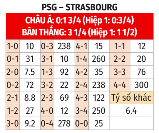 - Lẻ bàn thắng: 3/4 cuộc đối đầu gần nhất, 5/8 trận gần đây của PSG tại Ligue 1 và cả 8 trận vừa qua của Strasbourg đều khép lại với tổng bàn thắng là lẻ. Hơn nữa, 6/7 chuyến làm khách vừa qua của Strasbourg cũng khép lại với tổng bàn thắng không chia hết cho 2.