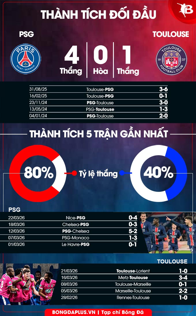 Với việc còn một trận chưa đấu so với Lens, họ có thể gây áp lực lớn lên đối thủ bằng cách giành chiến thắng trước Toulouse, trận đấu cuối cùng trước khi bước vào vòng tứ kết Champions League với Liverpool. Cần lưu ý rằng, PSG đã thắng cả 3 trận gần nhất gặp Toulouse tại Ligue 1, trong đó có chiến thắng 3-0 ở mùa trước.