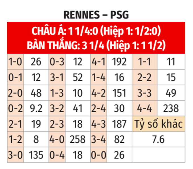 - Rennes thua theo châu Á: Rennes thua cả 6 trận gần đây, thua cả 3 trận sân nhà vừa qua. Còn PSG thắng 4/5 trận đối đầu gần nhất với Rennes tại Ligue 1. Vì thế, nhiều khả năng Rennes sẽ thua theo châu Á trận này.