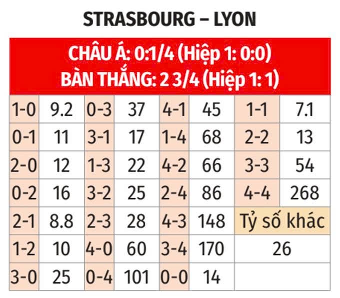 Đội bóng vùng Alsace đang có phong độ thiếu ổn định. Họ chỉ thắng 1, hòa 1, thua 2 ở 4 trận gần nhất và thường thi đấu không tập trung trong hiệp 1. Nếu khai thác được điểm yếu này của Strasbourg, Lyon sẽ cán mốc 14 trận toàn thắng và mở toang cơ hội cạnh tranh Top 2 Ligue 1 mùa này.