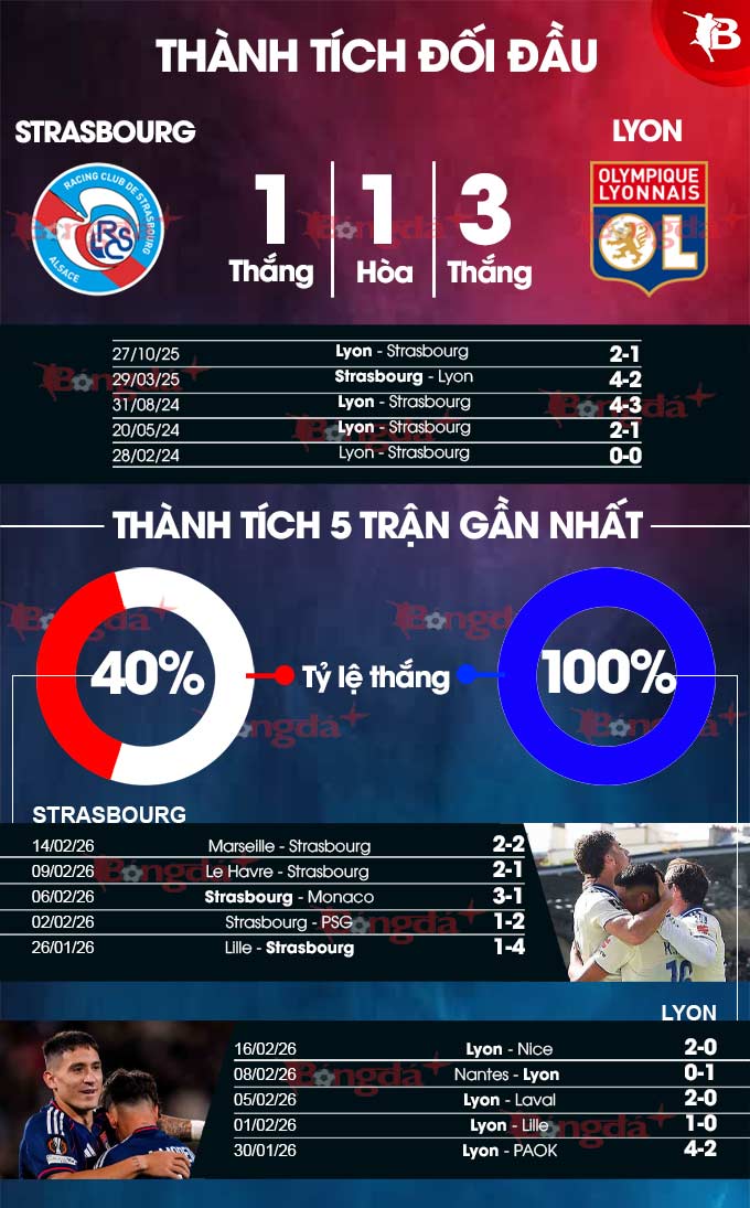 14. Lyon áp đảo ở 14 cuộc chạm trán gần nhất giữa hai đội tại sân La Meinau. Cụ thể, họ thắng 9, hòa 2 và chỉ thua 3 ở 14 trận đấu nói trên.
