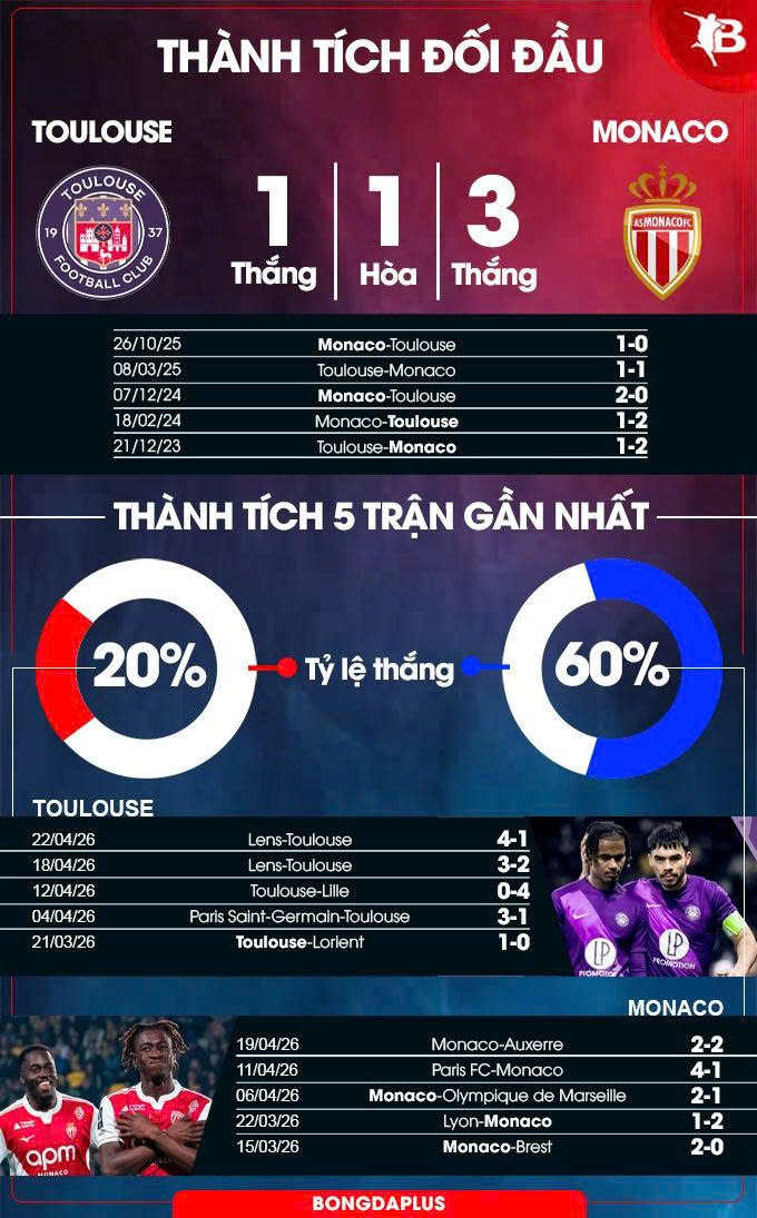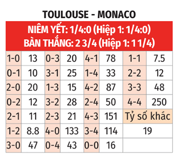 - Monaco thắng theo niêm yết: Monaco thắng theo niêm yết ở 7/9 trận gần nhất. Đá với Toulouse thua theo niêm yết 3/4 trận vừa qua, các vị khách là sự lựa chọn đáng tin cậy.