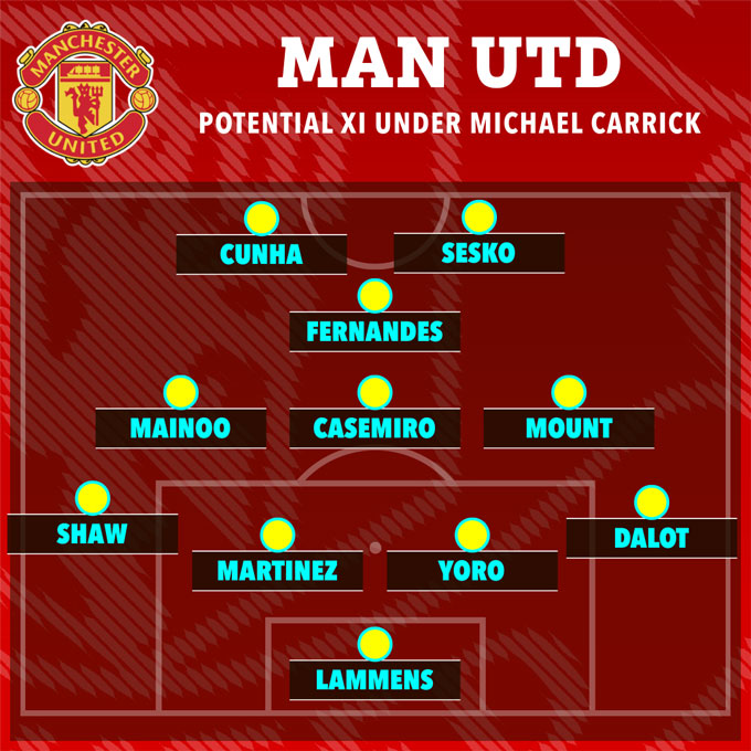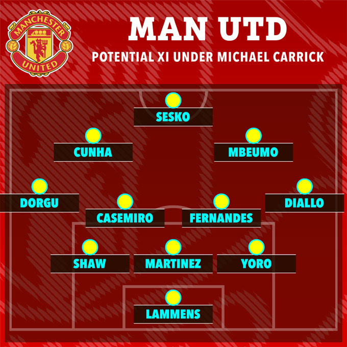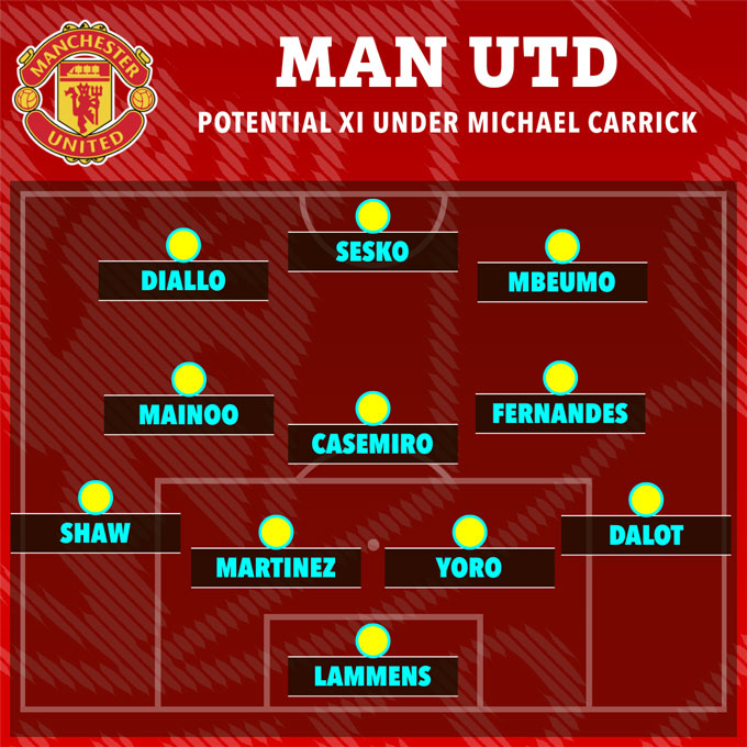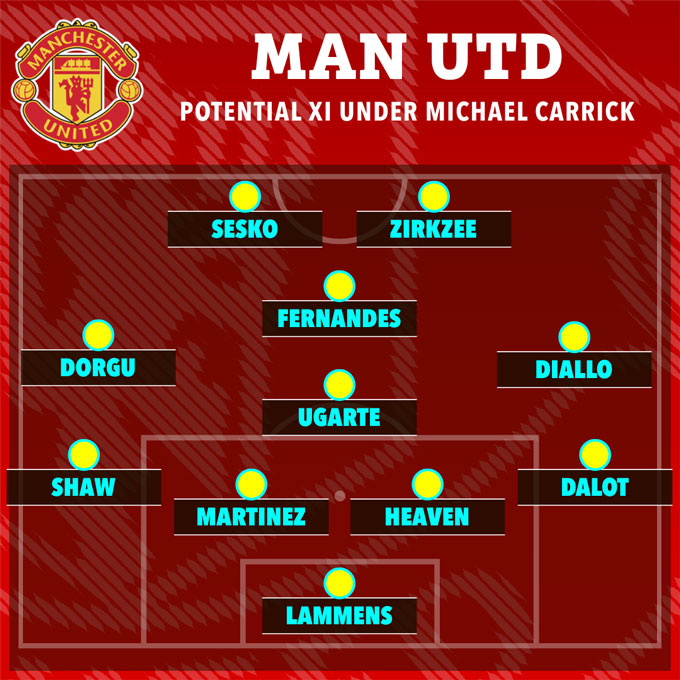 Trong trường hợp Carrick cho rằng Amorim đã đi đúng hướng và tiếp tục sử dụng hàng thủ ba người, vấn đề bố trí Shaw và Dorgu cùng đá sẽ được giải quyết, đồng thời Dalot và Diallo sẽ cạnh tranh vị trí wing-back phải.
