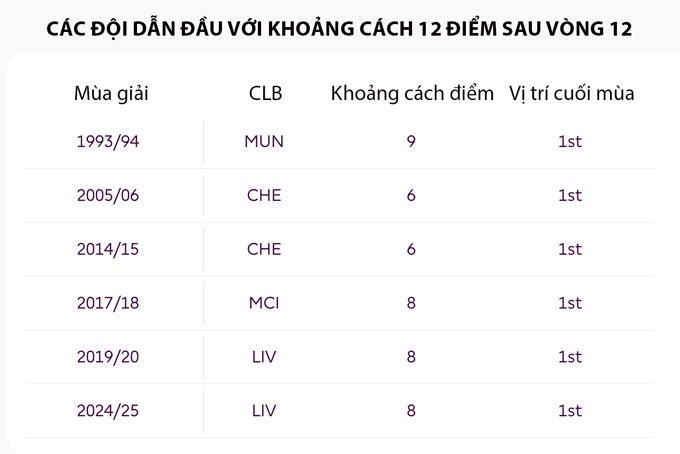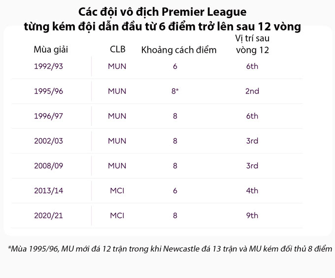 Thực tế có đến 7 lần một đội bóng bị dẫn 6 điểm sau 12 vòng nhưng vẫn trở lại để vô địch. Man United làm điều đó 5 lần (1992/93, 1995/96, 1996/97, 2002/03, 2008/09), còn Man City làm 2 lần (2013/14, 2020/21).