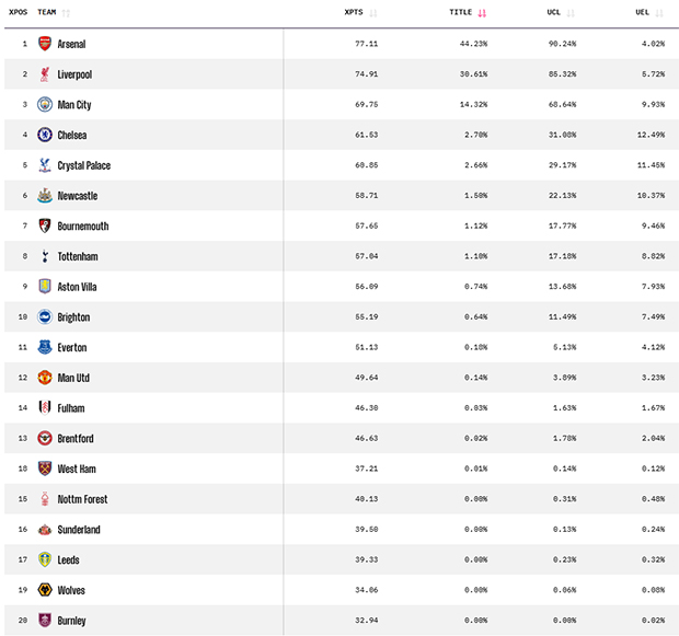 Cũng theo dự đoán của Opta, Arsenal có thể kết thúc Premier League mùa này với điểm số kì vọng là 77,11, hơn khoảng 2 điểm so với Liverpool (74,91). Đứng các vị trí tiếp theo trong top 4 theo dự đoán của Opta là Man City (69,75 điểm) và Chelsea (61,53%).
