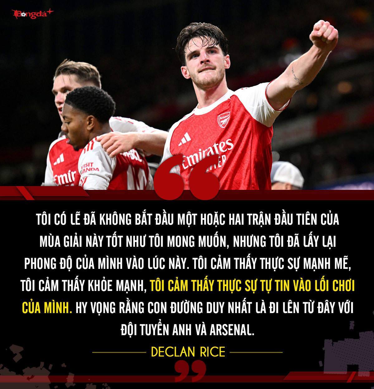 Rice đang dẫn đầu Arsenal mùa này về tổng số lần dẫn bóng, số đường chuyền vào vòng cấm và số cơ hội tạo ra. Những màn trình diễn gần đây của Rice đã khiến cựu đội trưởng "Pháo thủ" Patrick Vieira phải thốt lên đây là một "tiền vệ toàn diện".