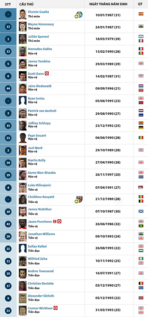 Việc Crystal Palace mới mang về Vicente Guaita và Cheikhou Kouyate khiến cho CĐV của họ không khỏi lo lắng. Lý do là bởi đội chủ sân Selhurst Park đã chia tay tới 7 cầu thủ ở đội một. Chính vì thế, HLV Hodgson có thể sẽ phải dùng nhiều cầu thủ trẻ ở mùa giải mới hoặc hi vọng BLĐ mang thêm một vài tân binh chất lượng nữa trước khi TTCN ở Anh đóng cửa vào ngày 9/8.