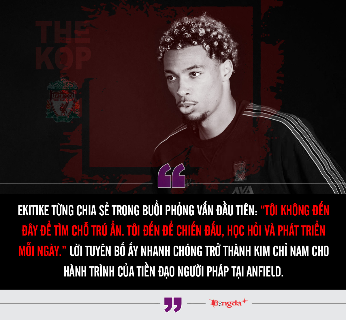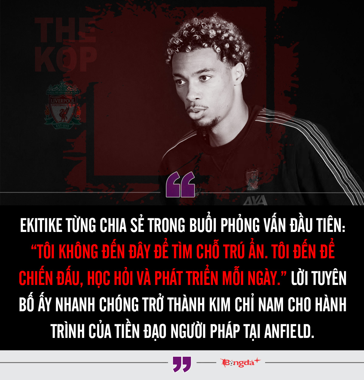 Chuyển tới Liverpool đồng nghĩa với việc anh phải đối mặt với hàng thủ rắn rỏi bậc nhất thế giới và lịch thi đấu dày đặc. Nhưng thay vì lo sợ hay đắn đo, Ekitike coi đó là động lực để bứt phá. Anh từng chia sẻ trong buổi phỏng vấn đầu tiên: “Tôi không đến đây để tìm chỗ trú ẩn. Tôi đến để chiến đấu, học hỏi và phát triển mỗi ngày.” Lời tuyên bố ấy nhanh chóng trở thành kim chỉ nam cho hành trình của tiền đạo người Pháp tại Anfield.