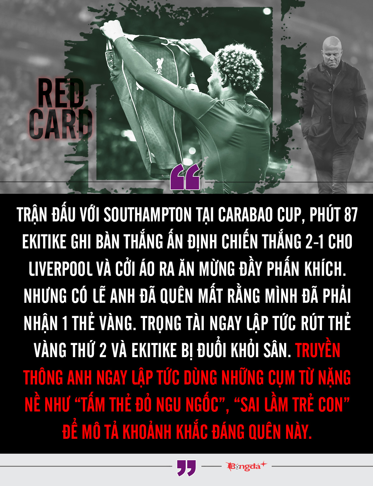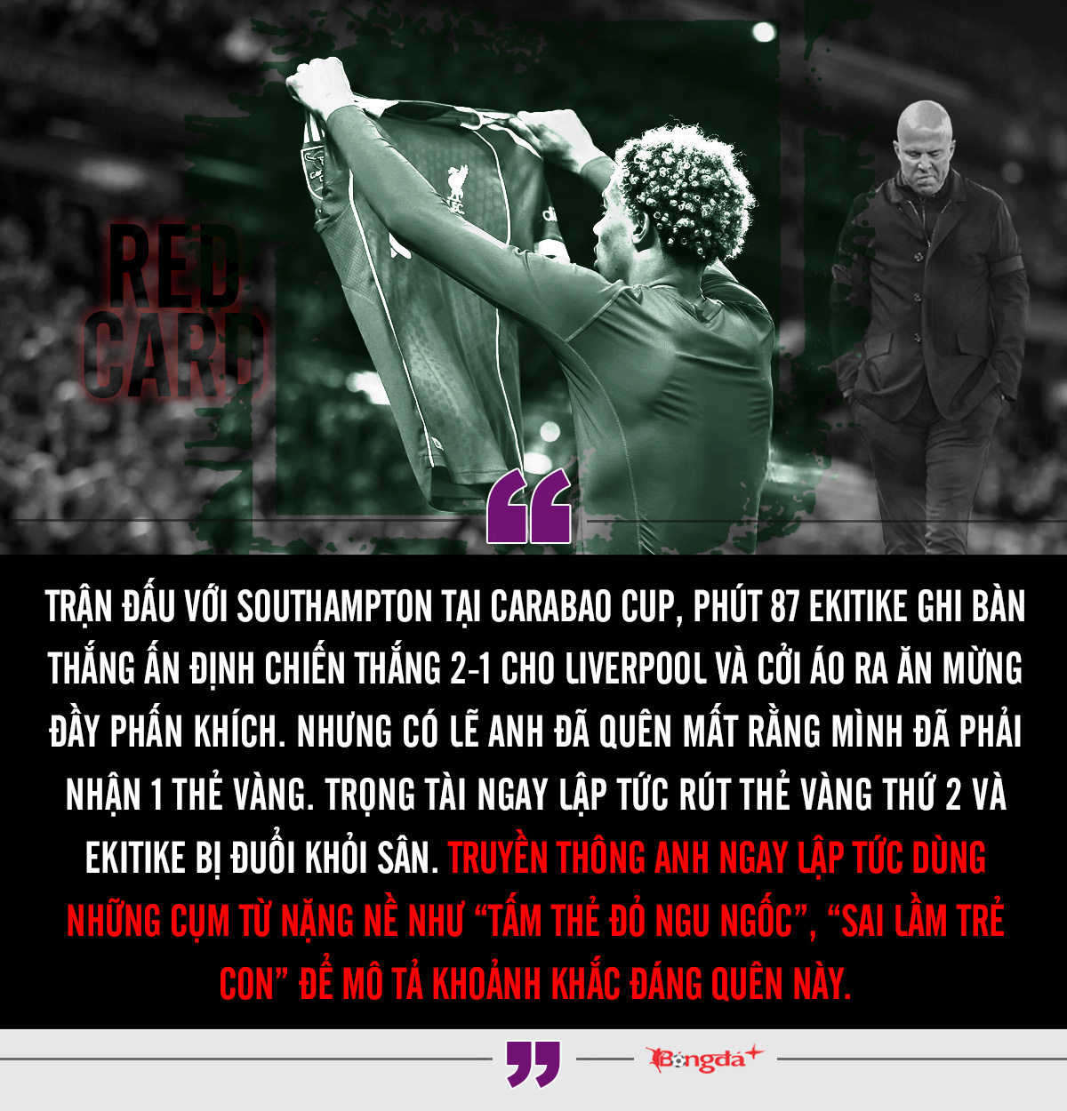 Ngay chính HLV Arne Slot cũng hoàn toàn không hài lòng với thái độ thiếu kỷ luật của học trò. Ở buổi họp báo sau trận gặp Southampton, nhà cầm quân Hà Lan đưa ra lời chỉ trích gay gắt: “Tôi nghĩ điều đó thật ngu ngốc, kể cả khi bạn chưa phải nhận 1 thẻ vàng trước đó. Có thể tôi hơi cổ hủ nhưng Ekitike không cần làm như vậy”.