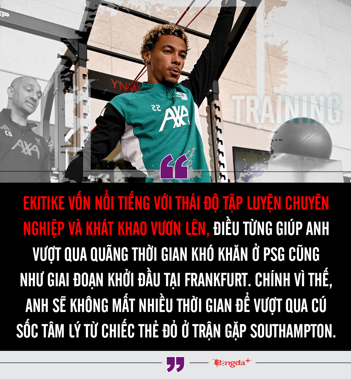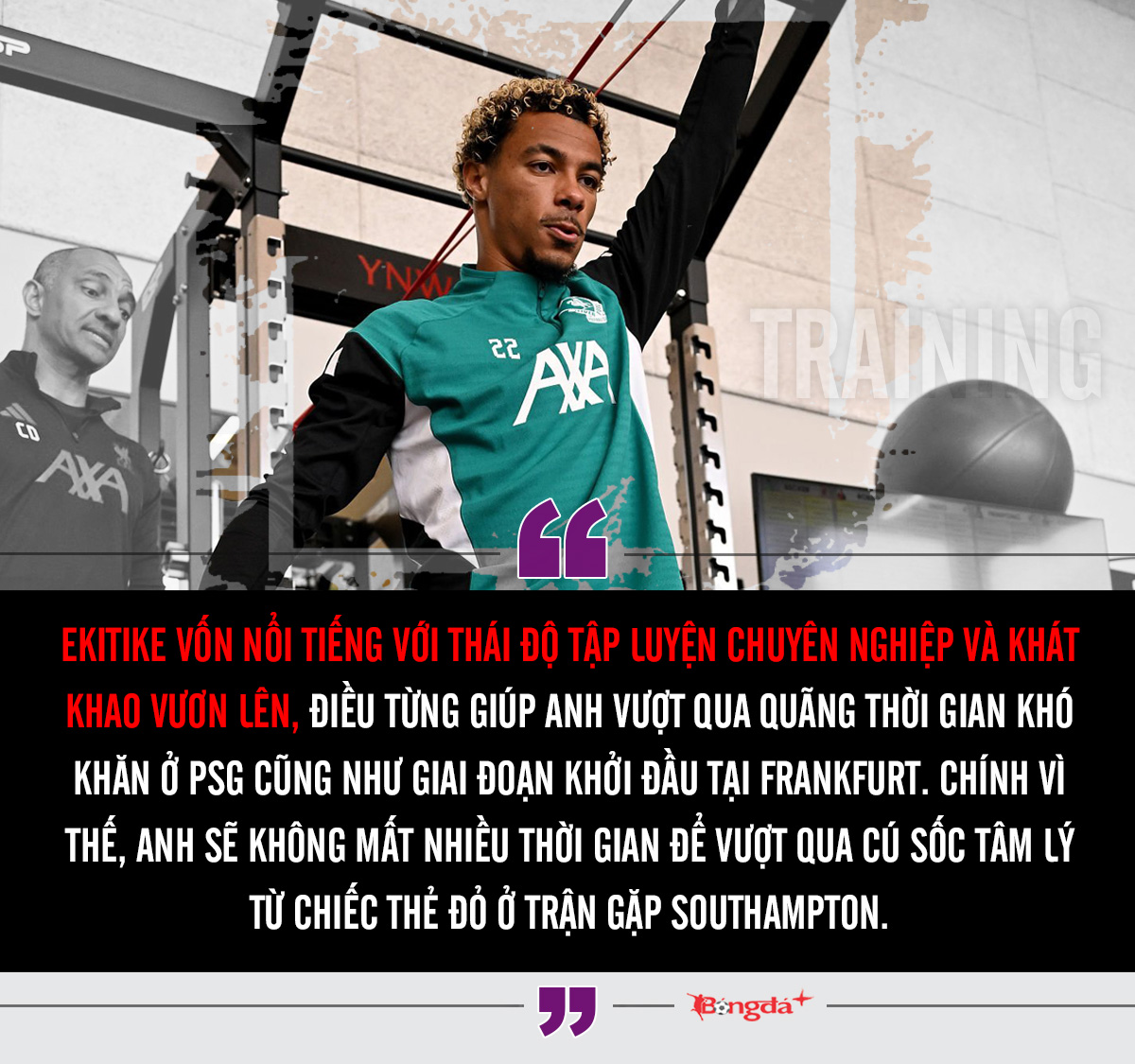 Ekitike vốn nổi tiếng với thái độ tập luyện chuyên nghiệp và khát khao vươn lên, điều từng giúp anh vượt qua quãng thời gian khó khăn ở PSG cũng như giai đoạn khởi đầu tại Frankfurt. Chính vì thế, anh sẽ không mất nhiều thời gian để vượt qua cú sốc tâm lý từ chiếc thẻ đỏ ở trận gặp Southampton.