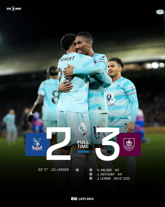Trong một diễn biến khác, Crystal Palace và Burnley tạo nên cuộc rượt đuổi tỷ số đáng chú ý ngay trong hiệp một. Palace vươn lên dẫn 2-0 chỉ sau 33 phút nhờ cú đúp của Larsen. Tuy nhiên từ phút 40 đến 45+2, Burnley đã ghi liền 3 bàn.