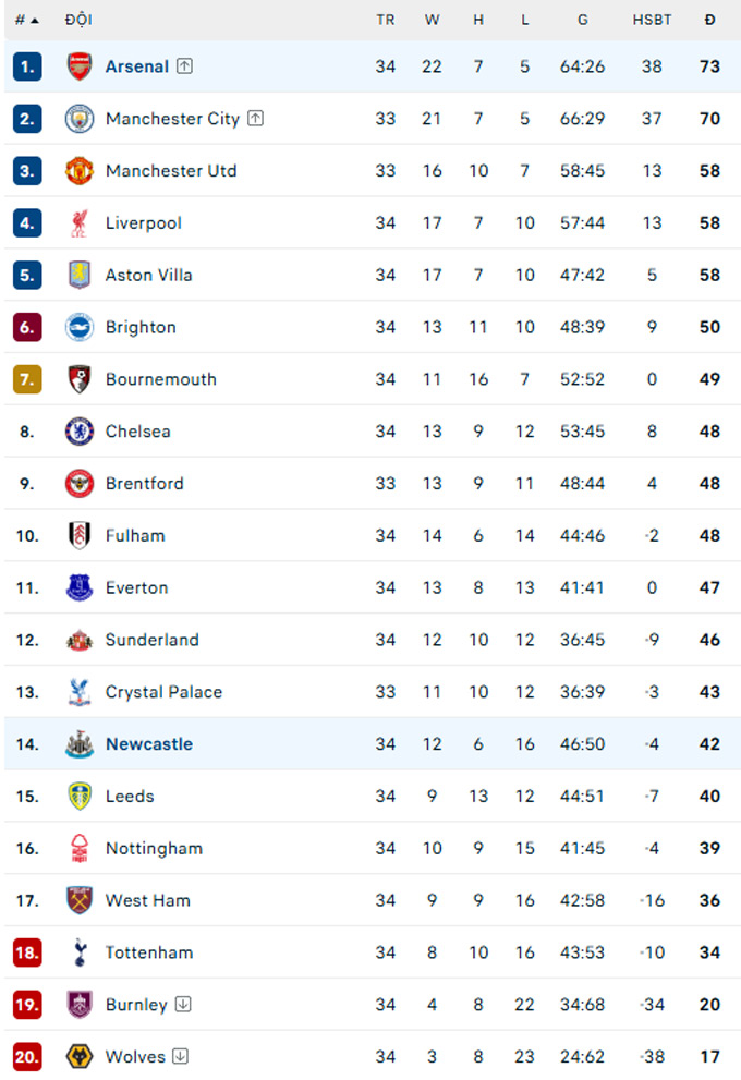 Kết quả này giúp Arsenal chiếm lại ngôi đầu từ tay Man City. Hiện tại, thầy trò Arteta sở hữu 73 điểm, hơn Man xanh 3 điểm. Ở vòng 35, Arsenal sẽ gặp Fulham, vẫn trên sân nhà Emirates, vào ngày 2/5.