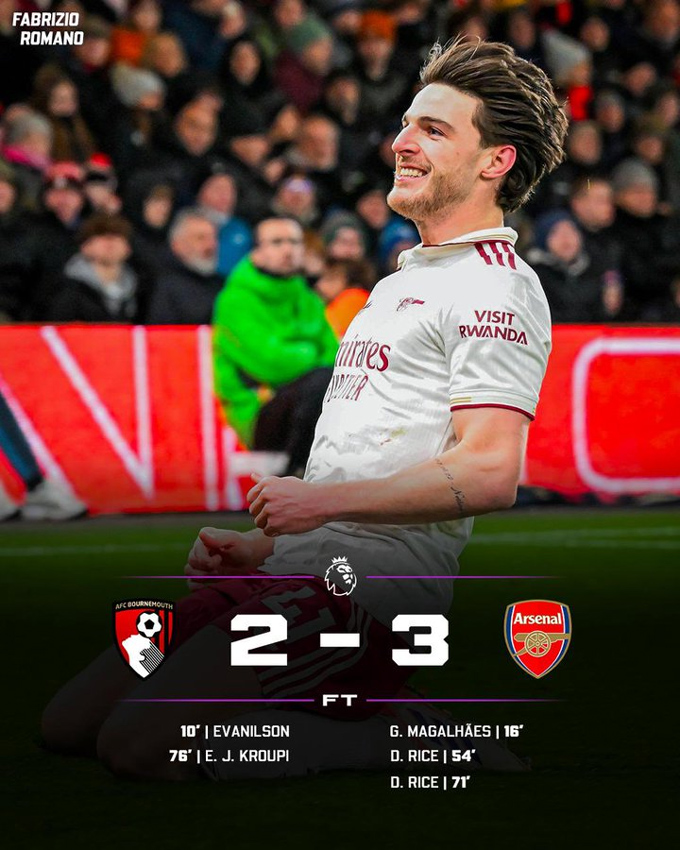 Bournemouth cố gắng dồn lên nhưng thể lực đuối dần. Họ đánh mất hoàn toàn thế trận sau khi Arsenal thay bộ ba tấn công mới vào sân. Phút 71, Saka đâm xuống đáy biên và trả ngược ra cho Rice hoàn thành cú đúp theo cách khá dễ dàng.