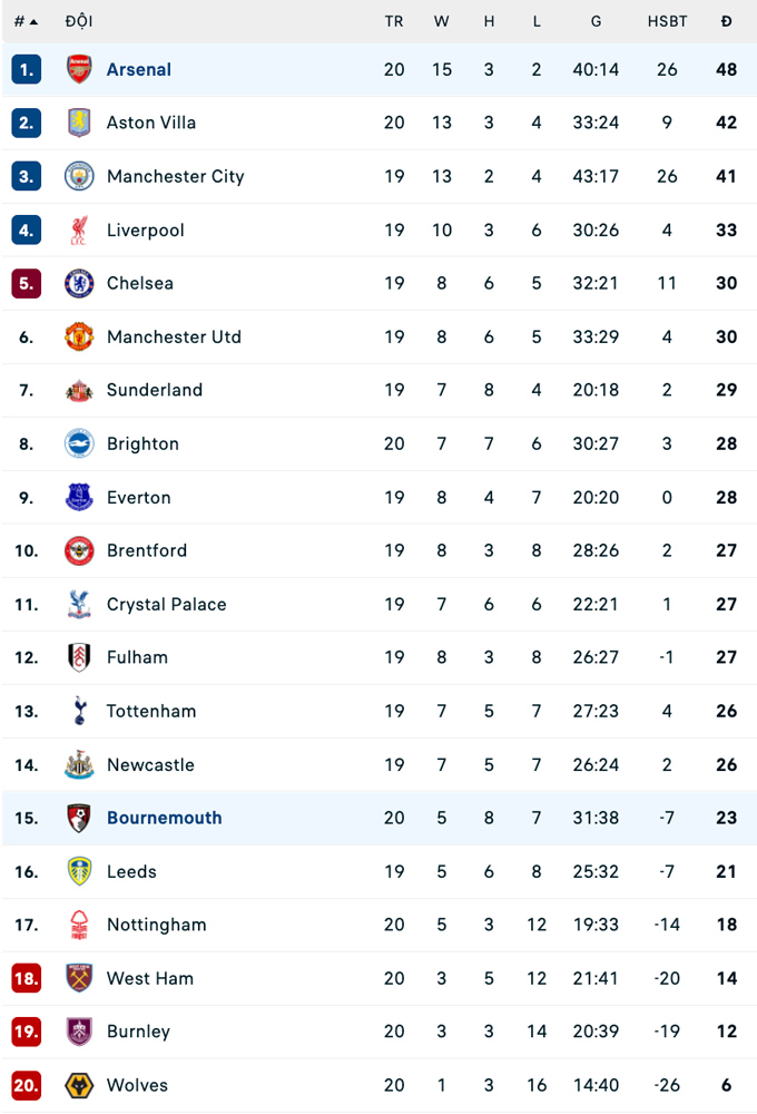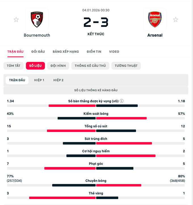 Đội hình thi đấu Bournemouth vs Arsenal