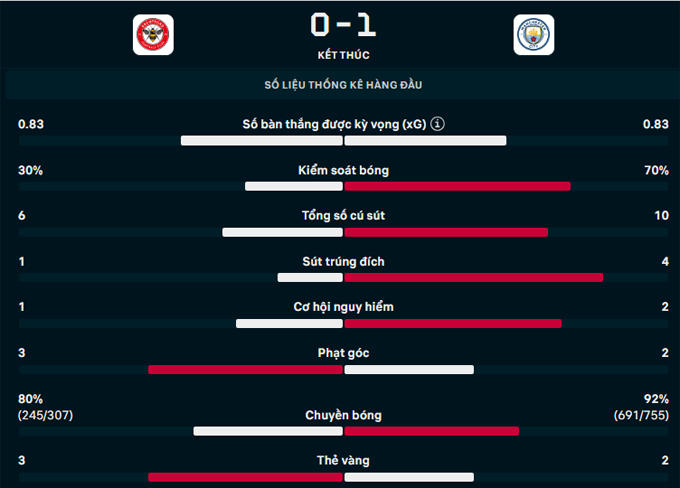 Chiến thắng giúp Man City tạm thu hẹp khoảng cách với nhóm đầu. Hiện Man City đang đứng thứ 5 trên BXH với 13 điểm sau 7 trận còn Brentford có mặt ở vị trí thứ 16 khi có 7 điểm.