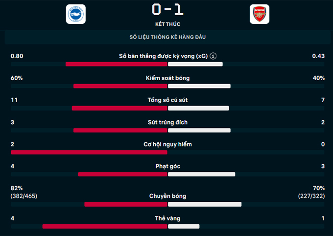 Sau bàn dẫn trước, Arsenal chủ động chơi chậm còn Brighton đẩy cao đội hình tấn công toàn diện. Đội bóng của Fabian Hurzeler kiểm soát hoàn toàn khu vực trung tuyến và liên tục dồn ép đối thủ. Dù vậy, 1-0 nghiêng về Arsenal là kết quả cuối cùng của trận này.
