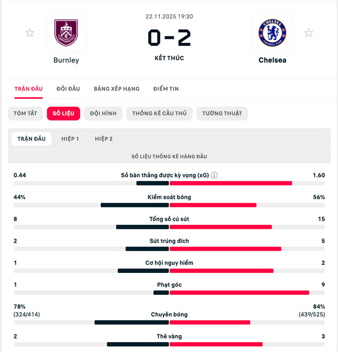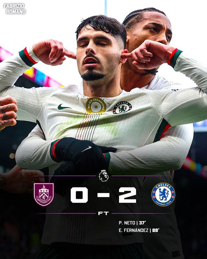 Thời gian còn lại là quá ít để Burnley có thể tìm được bàn thắng danh dự. Chung cuộc họ đành chấp nhận trận thua 0-2 ngay trên sân nhà và tiếp tục ngụp lặn ở nhóm cuối BXH. Trong khi đó, Chelsea vẫn đang kiên cường đua tranh ngôi đầu với Arsenal và Man City.