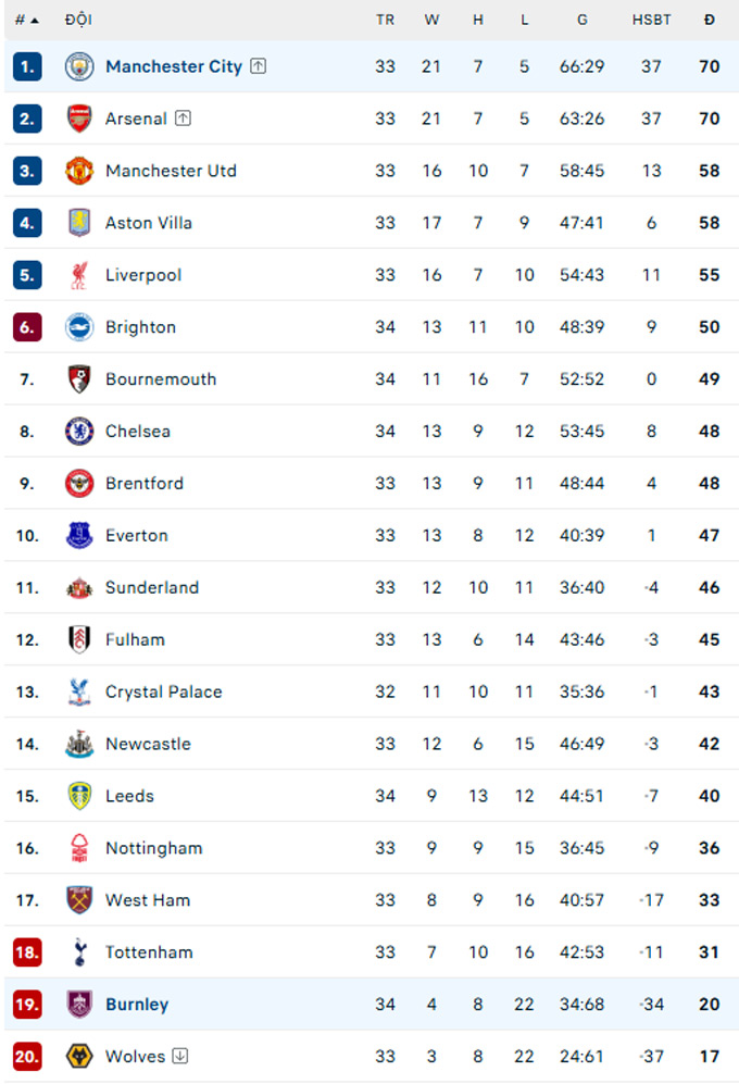 Dù cùng điểm (70) và cùng hệ số bàn thắng bại (+37) với Arsenal, Man City xếp trên nhờ ghi nhiều bàn thắng hơn (66 vs 63). Arsenal vẫn có thể đòi lại vị trí số một khi tiếp đón Newcastle cuối tuần này, trong lúc Man City bận đá bán kết FA Cup với Southampton.