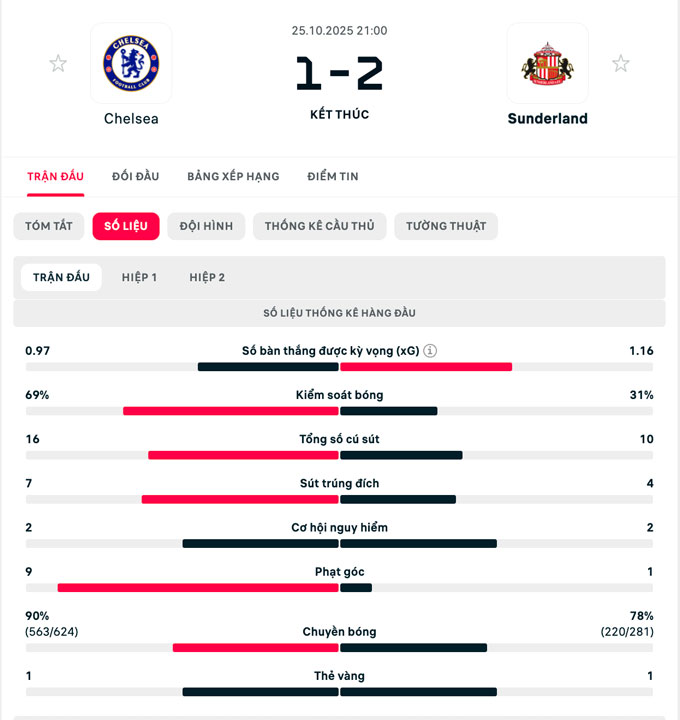 Kết quả cuối cùng của trận đấu này là 2-1 nghiêng về phía đội khách Sunderland.