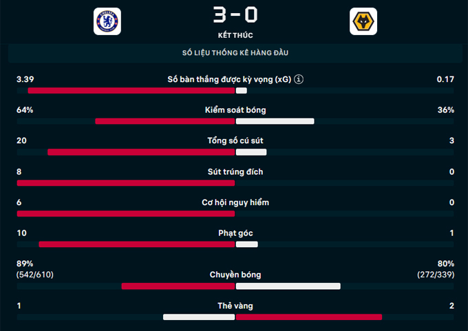 Để thua 2 bàn, tinh thần các cầu thủ Wolves xuống thấp. Đến phút 73 họ thủng thêm bàn nữa, lần này Chelsea phản công và Garnacho dọn cỗ cho Pedro Neto chọc thủng lưới CLB cũ. 3-0 cho Chelsea là kết quả cuối cùng của trận này và nhờ đó, đội bóng của Maresca tạm vươn lên nhì bảng.