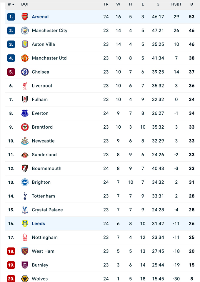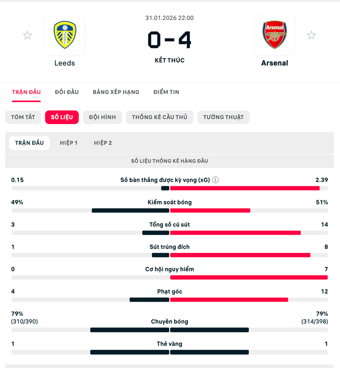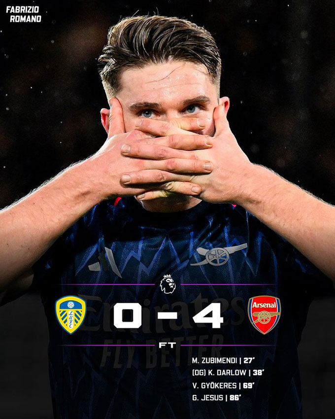Chung cuộc, Arsenal hủy diệt Leeds với tỷ số 4-0. Pháo thủ tạm nới rộng cách biệt với hai đội xếp sau là Man City và Aston Villa lên thành 7 điểm.