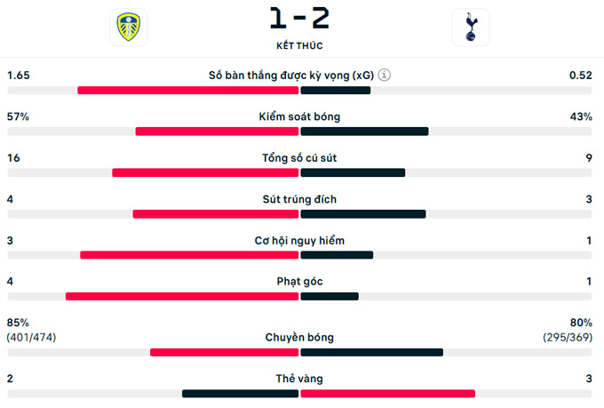Ở quãng thời gian còn lại, Leeds vùng lên đầy nỗ lực nhằm tìm kiếm bàn gỡ nhưng Tottenham đã đứng vững để bảo toàn thành quả mong manh. Chung cuộc, Spurs đánh bại Leeds 2-1 ngay tại Elland Road để tìm lại niềm vui chiến thắng sau mạch 2 trận chỉ hòa.