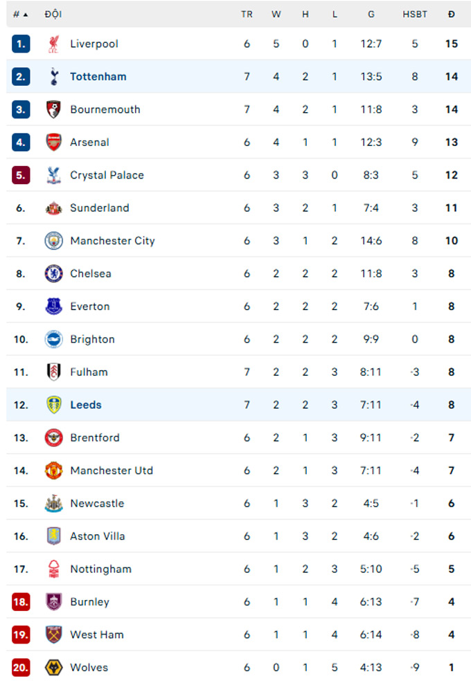 Thắng lợi quan trọng này giúp Tottenham leo lên vị trí thứ 2 trên BXH Ngoại hạng Anh 2025/26 với 14 điểm. Dù vậy, thứ hạng này chắc chắn sẽ bị xáo trộn vào thời điểm toàn bộ vòng 7 khép lại. Sau khi đợt tập trung ĐTQG tháng 10 kết thúc, Tottenham sẽ tiếp đón Aston Villa ở vòng 8 Premier League, diễn ra vào ngày 19/10.