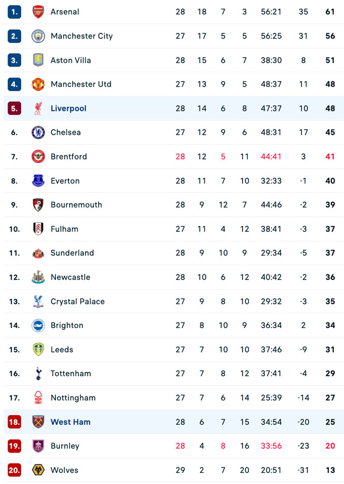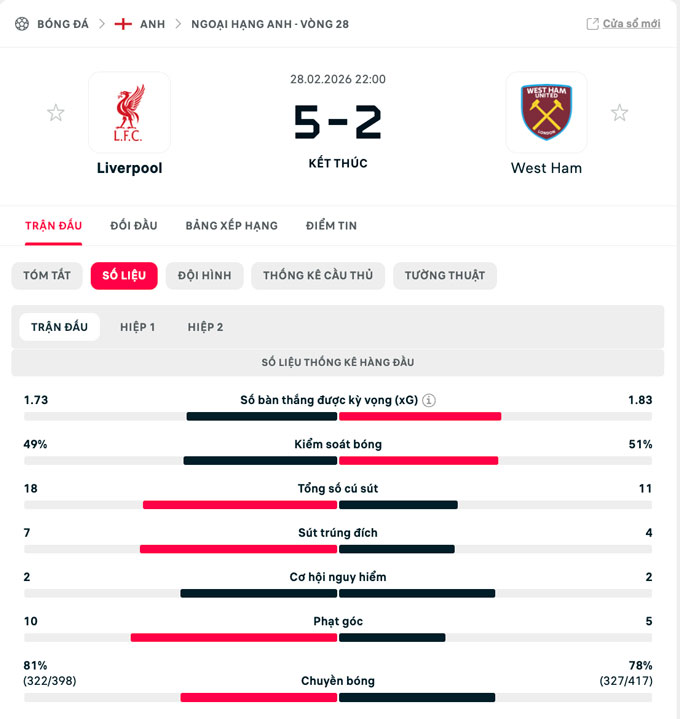5-2 là tỷ số cuối cùng của trận đấu. Liverpool giành 3 điểm thuyết phục trên sân nhà và tạm cân bằng về điểm số với đội đứng thứ 4 là Man United.