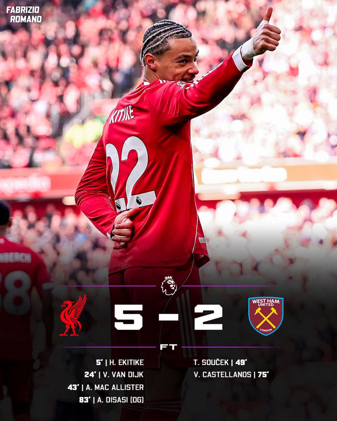 Được thi đấu trên sân nhà, Liverpool nhanh chóng tràn lên tấn công và sớm có bàn mở tỷ số ngay phút thứ 5. Từ đường chuyền của Gravenberch, Ekitike nhận bóng trong vòng cấm trước khi dứt điểm tung lưới West Ham.