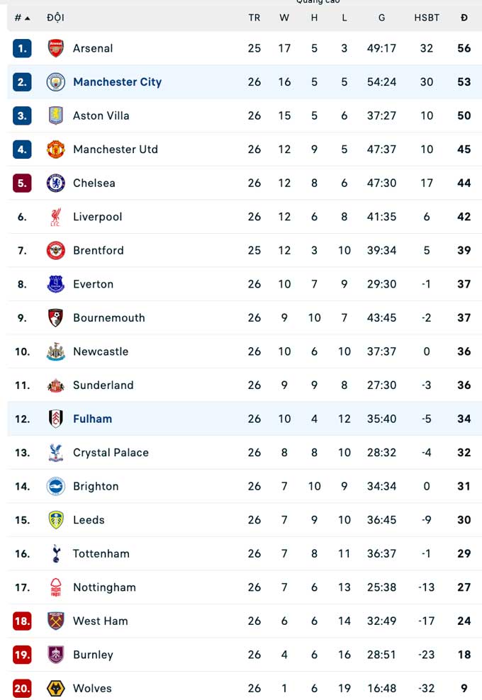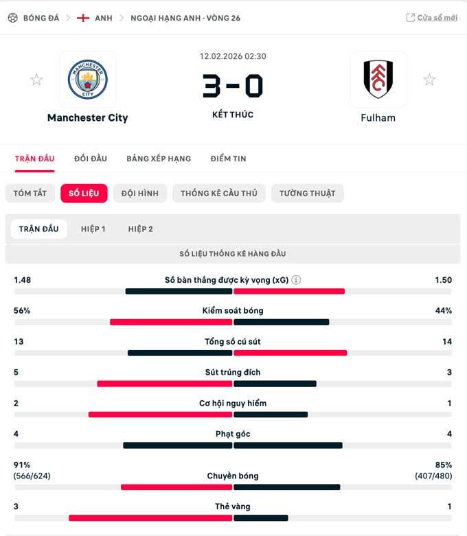Kết quả cuối cùng của trận đấu này là 3-0 nghiêng về phía Man City. Đội bóng của Pep Guardiola tạm hu hẹp cách biệt với đội đầu bảng Arsenal xuống còn 3 điểm.