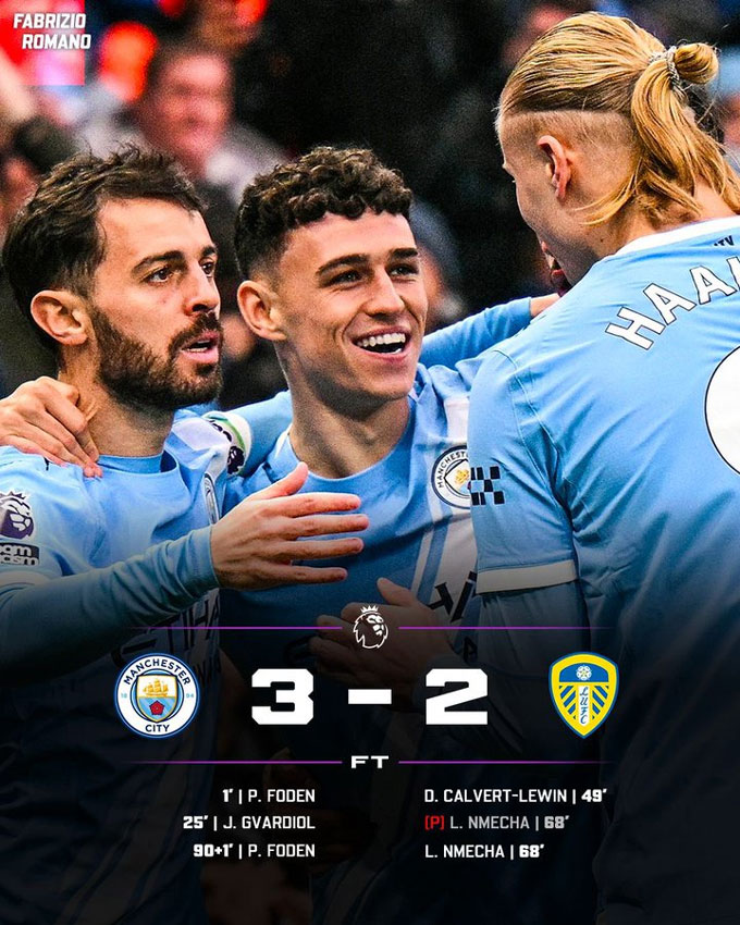 Bị gỡ hòa sốc, Man City buộc phải dâng cao tấn công điên cuồng. Và đúng vào phút bù giờ đầu tiên của hiệp 2, họ đã có được điều mình cần. Foden đi bóng nỗ lực cắt ngang khung thành của Leeds trước khi tung cú dứt điểm chìm hiểm hóc đánh bại thủ thành Perri.