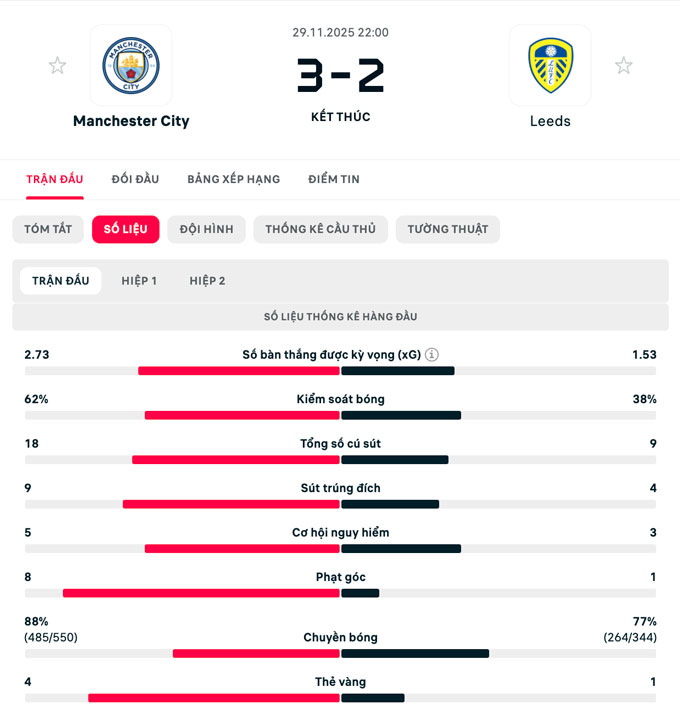 Kết quả cuối cùng của trận đấu này là 3-2 nghiêng về phía Man City. Đội bóng của Pep Guardiola tạm đòi lại ngôi nhì bảng và tạm thu hẹp cách biệt với Arsenal xuống còn 6 điểm. Họ sẽ ngồi chờ Chelsea và Arsenal đại chiến vào tối Chủ nhật.