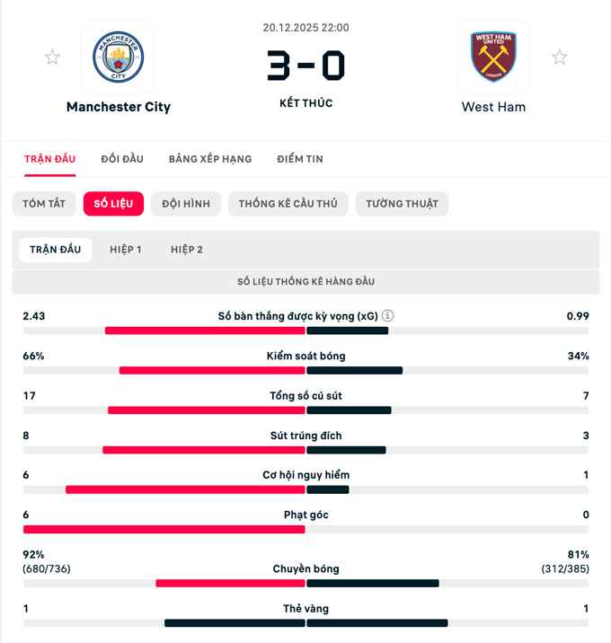 Kết quả cuối cùng của trận đấu này là 3-0 nghiêng về phía Man City. Đoàn quân của Pep Guardiola tạm chiếm ngôi đầu Ngoại hạng Anh trước khi Arsenal ra sân gặp Everton sau đây vài tiếng.