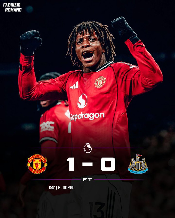 Trong những phút đầu tiên, MU nhập cuộc khá tự tin và tạo ra khá nhiều cơ hội nguy hiểm về phía khung thành của Newcastle. Tới phút 24, đội chủ nhà đã có bàn thắng mở tỷ số. Từ một pha phá bóng lập bập của Woltemade, Dorgu tung ra cú vô lê trái phá, đưa bóng găm thẳng vào góc thấp khung thành.