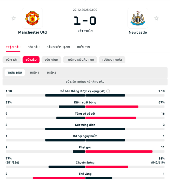 Newcastle liên tục dồn ép ở những phút cuối nhưng hàng thủ của MU vẫn đứng vững. Thêm vào đó, các pha dứt điểm của cầu thủ đội khách cũng không có sự chính xác cần thiết.