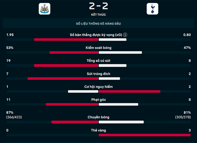 Với kết quả này, Newcastle lỡ cơ hội vươn lên nửa trên BXH trong khi Tottenham tiếp tục chuỗi trận không thắng khi bị dẫn trước. Hiện tại, Newcastle và Tottenham có cùng 19 điểm nhưng CLB vùng Đông Bắc xếp sau đối thủ (13 so với 11) vì kém hiệu số.