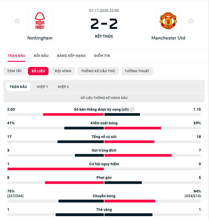 Kết quả cuối cùng của trận đấu này là 2-2. MU chấm dứt mạch trận toàn thắng ở con số 3 trong khi Nottingham cũng dứt mạch toàn thua ở con số 4.