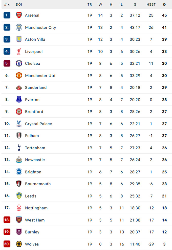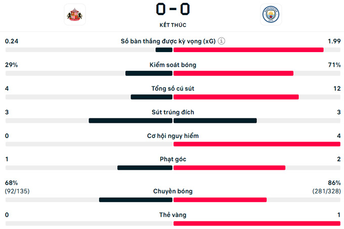 Chung cuộc, Man City hòa Sunderland 0-0 trên sân Ánh Sáng ở vòng 19 Premier League. Kết quả này khiến Man xanh khựng lại ở cuộc đua vô địch với Arsenal. Hiện tại, họ đang đứng thứ 2 với 41 điểm, kém Pháo thủ 4 điểm.