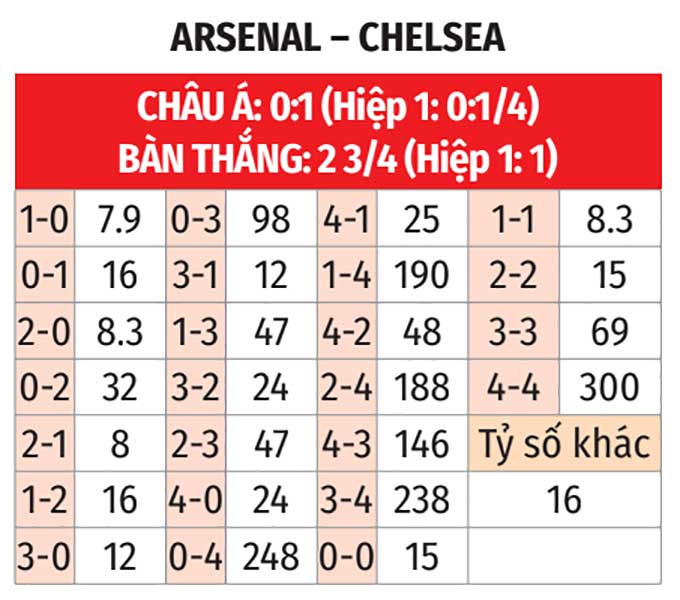 - Tỷ số chẵn: Cả 4 trận gần đây của Chelsea đều kết thúc với tỷ số chẵn. 3/4 trận gần nhất của Arsenal cũng có số bàn thắng chia hết cho 2.