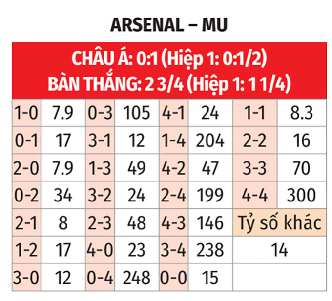 - Tỷ số chẵn: 4/5 trận gần đây của MU đều kết thúc với tỷ số chẵn. 3/4 trận gần nhất giữa đội bóng này và Arsenal cũng có số bàn thắng chia hết được cho 2.
