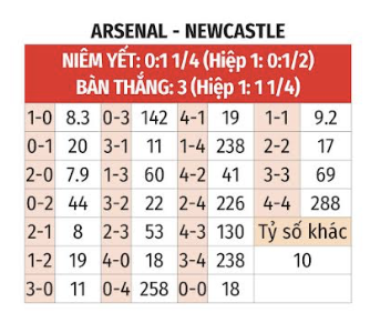 Tổng bàn thắng là số lẻ: 5/7 lần đụng độ gần nhất của 2 đội có tổng bàn thắng là số lẻ. 4/5 trận gần nhất của Arsenal cũng có kịch bản tương tự. 5 trận gần nhất của Newcastle cũng có số lần lưới rung không chia hết cho 2. Số bàn thắng trận này sẽ không chia hết cho 2.