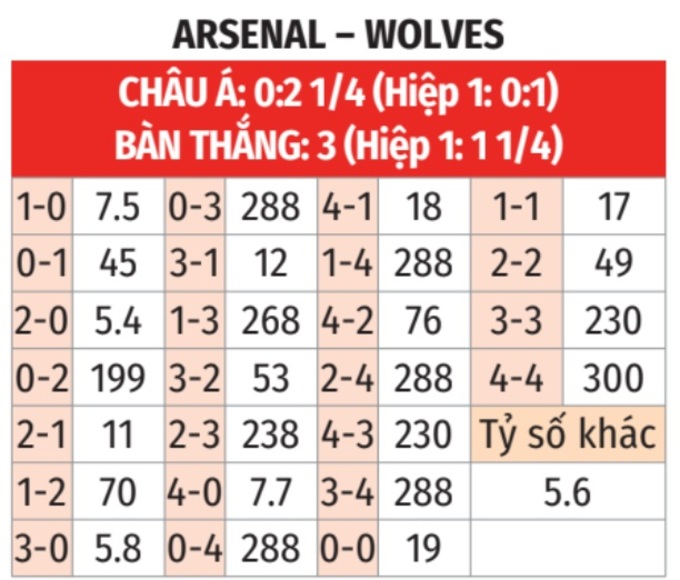 - Lẻ bàn thắng: 4/5 lần đối đầu giữa 2 đội gần đây kết thúc với tổng bàn thắng là số lẻ. Cả 2 trận gần nhất của Arsenal và 7/8 trận vừa qua của Wolves xảy ra tình trạng tương tự.