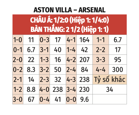 - Cả 2 đội ghi bàn: 3/4 trận gần nhất của Aston Villa có hiện tượng cả 2 đội ghi được bàn thắng. 4/5 trận gần nhất của Arsenal cũng có kịch bản tương tự xảy ra. Cả Arsenal và Aston Villa đều có hàng công mạnh. Trận này sẽ có 2 đội ghi được bàn thắng.