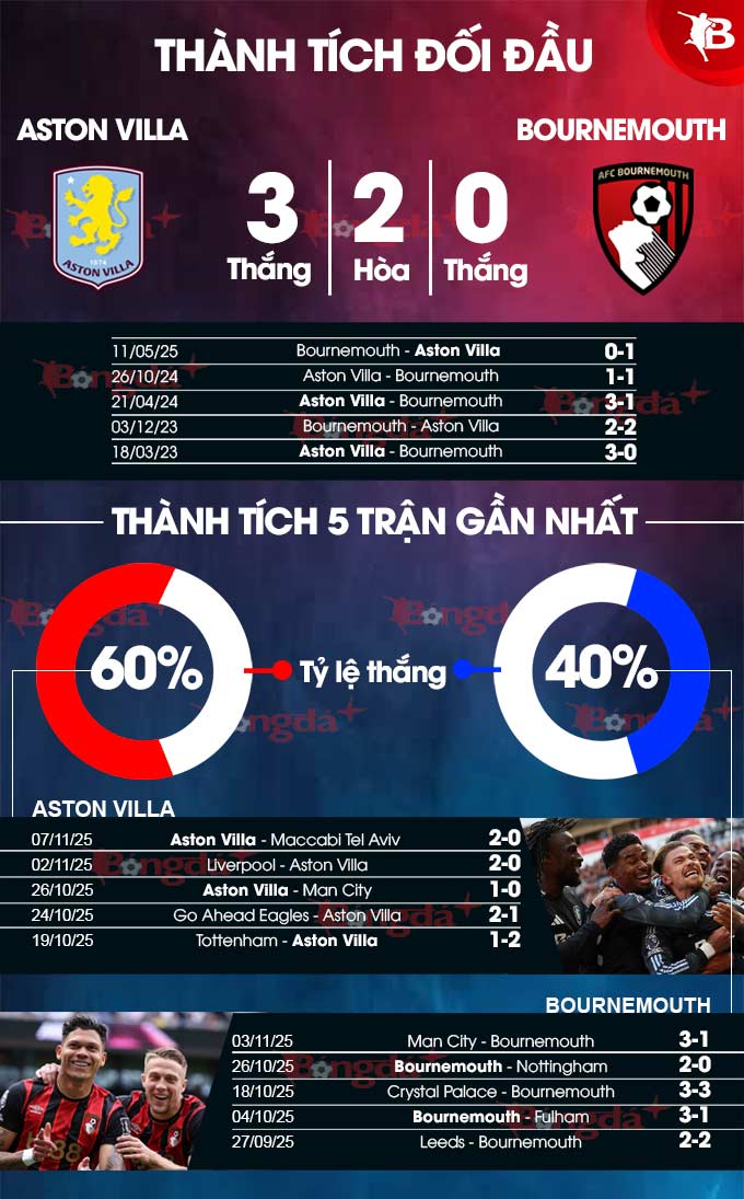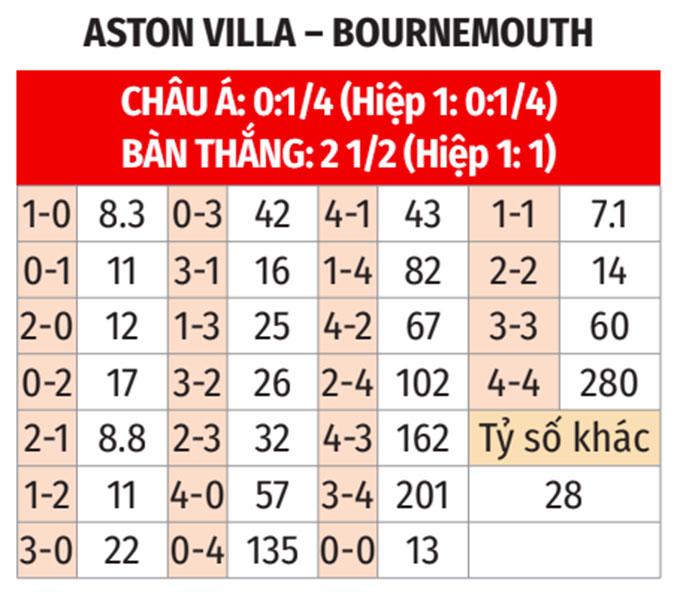 Điều này cho thấy nếu muốn có cơ hội giành chiến thắng cao hơn trước Bournemouth lần này, Aston Villa cần nỗ lực ghi bàn trước. Cần nhấn mạnh rằng, Aston Villa bất bại trong 5 trận gần nhất gặp Bournemouth tại Premier League (thắng 3, hòa 2), trước đó họ đã thua 4 trận liên tiếp trước đối thủ này.