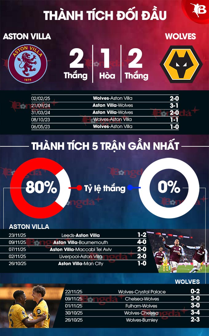 - Tối thiểu 3 bàn cả trận: 5/7 trận đấu gần đây của Aston Villa tại giải Ngoại hạng Anh đều có từ 3 bàn thắng trở lên. Tình trạng tương tự xảy ra ở 4/5 trận gần nhất của Wolves.