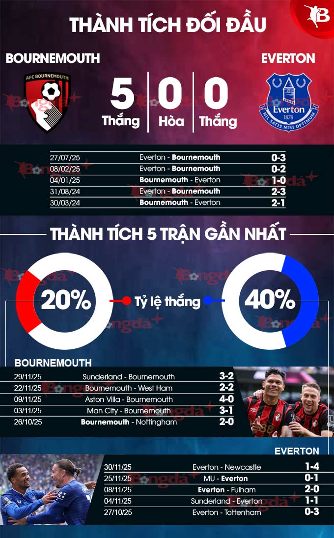 9. Ở 11 lần chạm trán gần nhất trên mọi đấu trường, Bournemouth áp đảo với 9 chiến thắng, trong khi Everton chỉ có 2. Đặc biệt, Bournemouth đang sở hữu chuỗi 5 trận toàn thắng trước đối thủ áo xanh đến từ vùng Merseyside.