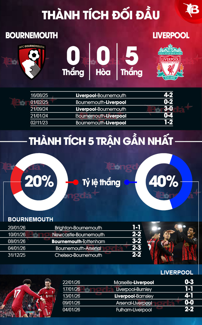 Lịch sử đối đầu cho thấy sự áp đảo của Liverpool trước Bournemouth, khi họ toàn thắng 6 trận gặp nhau gần nhất. Nếu tính xa hơn, Liverpool thắng tới 13 và chỉ thua 1 trong 14 lần gặp nhau gần đây nhất giữa hai đội.