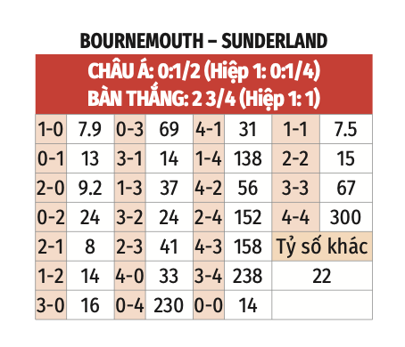 - Tổng bàn thắng là số chẵn: 5/7 trận gần nhất của Bournemouth có tổng bàn thắng là số chẵn. 3/5 trận gần nhất của Sunderland có kịch bản tương tự. Số lần lưới rung trận này sẽ chia hết cho 2.