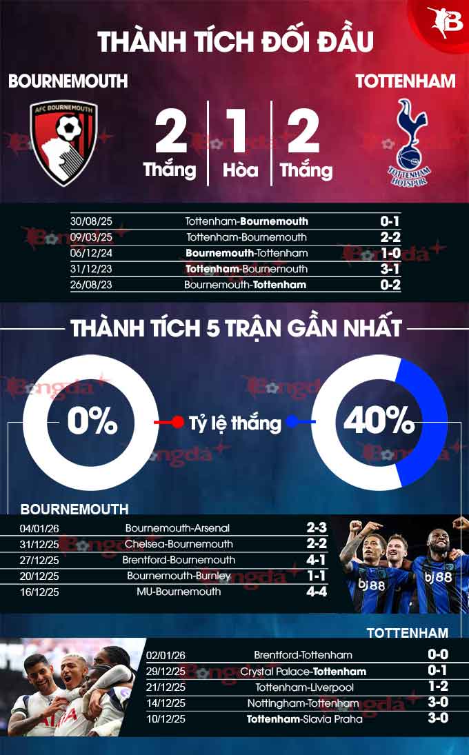 Sân nhà cũng chưa hẳn là lợi thế với Bournemouth, bởi họ đang trải qua mạch 5 trận không thắng tại sào huyệt của mình. Riêng ở Premier League mùa này, họ chưa từng một lần đánh bại các thành viên trong nhóm “Big Six”. Thế nên, Tottenham càng có lý do để yên tâm trong chuyến hành quân lần này.