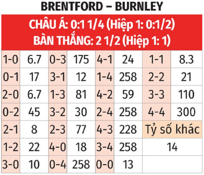 - Brentford thắng châu Á: Trên sân nhà, Brentford đang sở hữu thành tích thắng theo châu Á 6 và hòa 1 ở 7 trận vừa qua. Trong khi đó, Burnley bước vào trận đấu này với 3 trận liên tiếp toàn thua theo cả chuyên môn và thành tích châu Á.